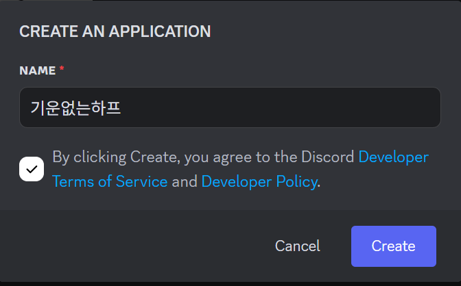 NAME에 봇 이름 입력하고, 체크박스 체크한 후에 Create를 눌러주시면 봇이 생성됩니다.