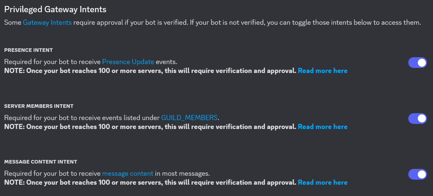 다음은 Gateway Intent 권한을 설정해줄 차례입니다. Bot 페이지에서 좀만 내리면 이런 메뉴가 나오는데요, intent로 끝나는 3개 다 켜주시면 됩니다. 이 권한은 서버 목록, 서버 멤버 가져오기 등의 기능을 위해 필요한 권한이라고 하네요!