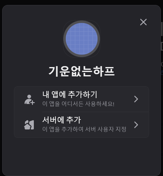이렇게 디스코드에서 창이 뜹니다. 서버에 추가 눌러서 자신의 서버에 추가하시면 됩니다!