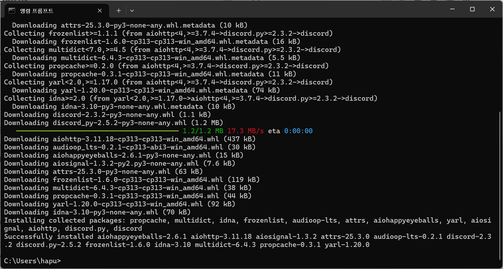 명령 프롬프트에서 pip install discord 입력하시고 엔터를 누르고 기다리면